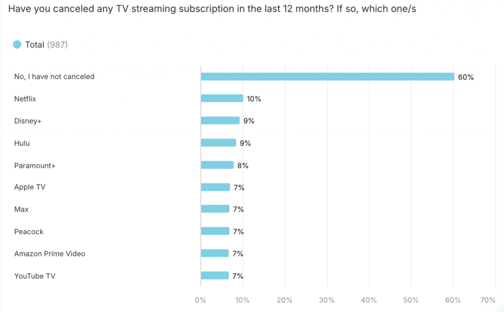Nearly 40% of US consumers say they have canceled a subscription to a TV streaming service in the last 12 months, with Netflix and Disney+ having sustained the highest rates of cancelation (around 10% of respondents said they had canceled).