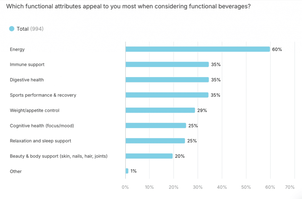 While energy remains the most in-demand functional attribute, this research shows there’s growing interest in benefits tied to digestive, immune, and cognitive health. This offers plenty of scope for innovation, but brands that lead with benefits must also back them with science. Consumers increasingly see clinical evidence as essential.