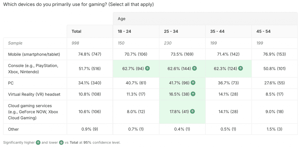 One age group – those between 25 and 34 – showed significantly higher likelihood of using a greater range of devices. For console, PC, VR headsets and cloud gaming services, this age group over-indexed when compared to other groups.