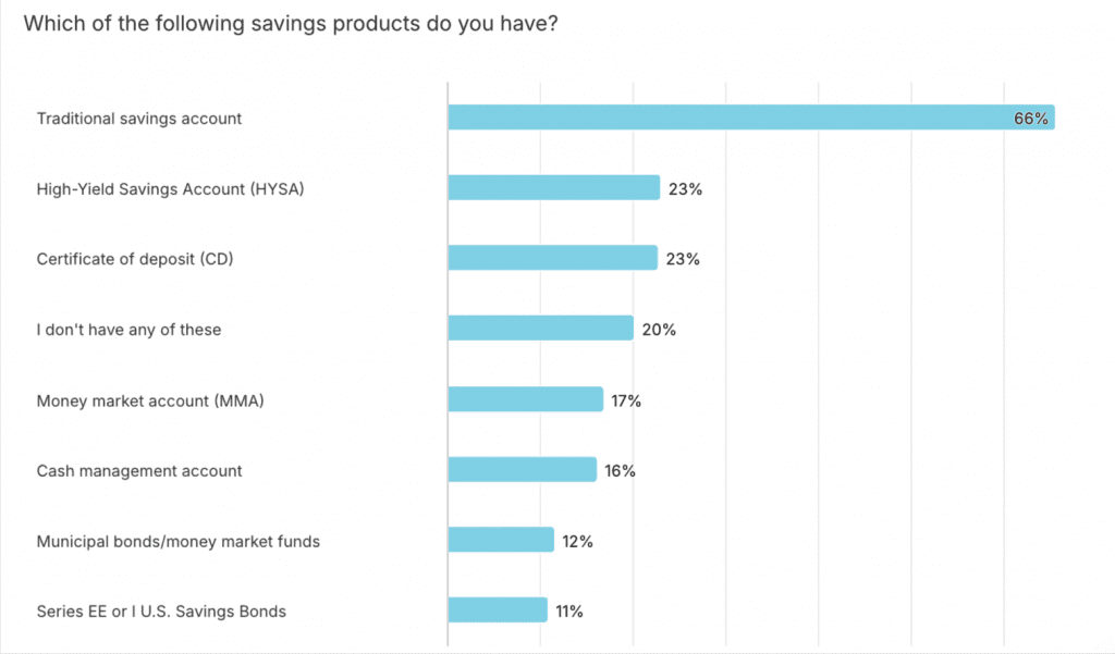 When it comes to the actual uptake of savings products among US consumers, the figures are significantly lower. Behind the traditional savings account, which 66% of Americans have, less than a quarter have a HYSA or CD. Only around 16% have an MMA or a cash management account, and around 11% have bonds. This suggests that barriers to entry – whether logistical, educational or behavioral – remain significant.