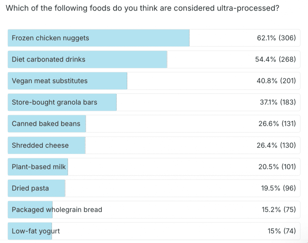With most consumers unable to define what UPF is, it’s little wonder that it’s challenging for them to identify which products are ultra-processed. We provided the following definition: “Ultra-processed foods typically involve industrial formulations with ingredients not commonly found in home cooking, such as artificial flavorings, colorings, emulsifiers.” We then asked them to select from a list of 10 products, which they thought were UPFs.